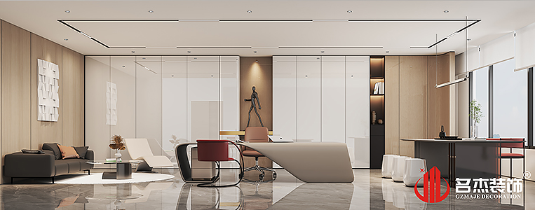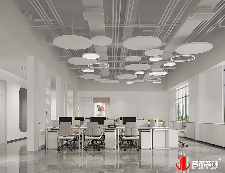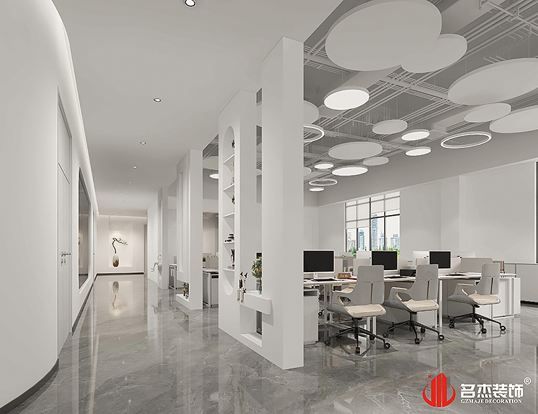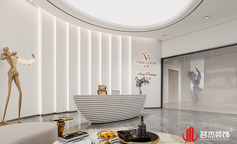 整體辦公裝修設(shè)計空間的設(shè)計格調(diào)是時尚輕奢的風(fēng)格,在前臺區(qū)域使用的是層疊的手法,加上大圓弧的吊頂,讓空間的層次感一下子就出來了。燈帶的加入也讓這個區(qū)域變得更加有時尚設(shè)計感。辦公裝修設(shè)計空間大量使用圓弧的元素,加以燈帶的組合搭配,也讓各個空間形成一種呼應(yīng)。