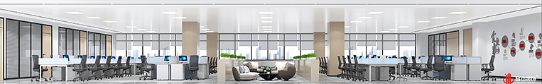 藍色作為企業標志色,設計師將它大量地運用在辦公室裝修設計空間中,不同明度的灰色與科技藍進行組合,提升了空間的層次感,營造出清透干凈的質感。天花弧形造型作為空間的點睛之筆,同時也是將空間的設計層次拔高到另一個層次。