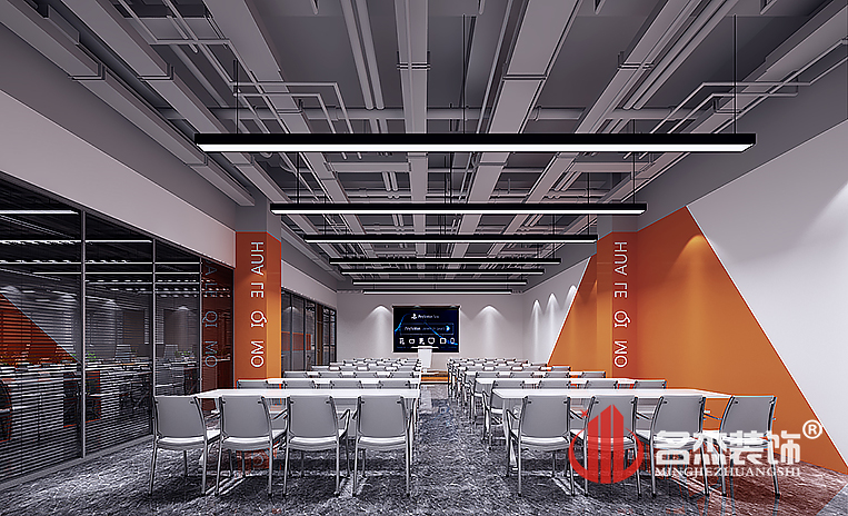 在辦公設計裝修區域里面加入了代表活力的橙色作為點綴色,讓整個辦公區域增添了不少時尚活力的氣氛,也和企業Logo的顏色相互呼應,將企業文化加入到整體的辦公環境當中。主要采用的是白色為主基調色,好處就在于能讓整個空間顯得更加大氣。