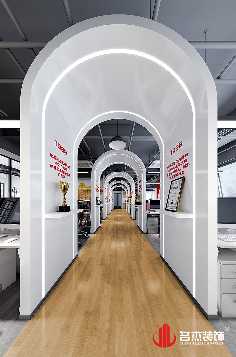 在前臺裝修設計的時候,燈帶的加入讓空間中充滿了不一樣的設計感,而且在辦公區域的過道旁邊,加入了時光隧道的設計元素,讓整個企業的發展歷程都能隨時讓人看見,企業文化也不知不覺中融入到整體的環境中。