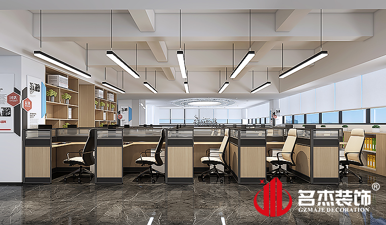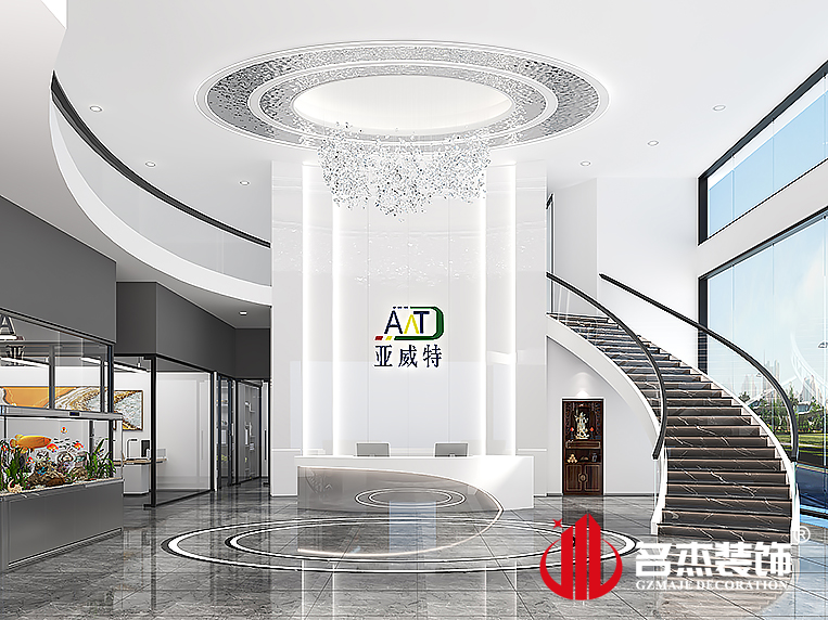 設計團隊以現代簡約的設計手法,重新打造了一個新型辦公室裝修設計空間。由于該企業的辦公室裝修設計空間的樓層是足夠高,因此在前臺設計上,通過加入一個圓弧形的樓梯來連接兩個樓層,設計感滿滿的。同時采用簡約的吊頂造型,配以原木色的元素,顯示出簡約而不簡單的設計風格。