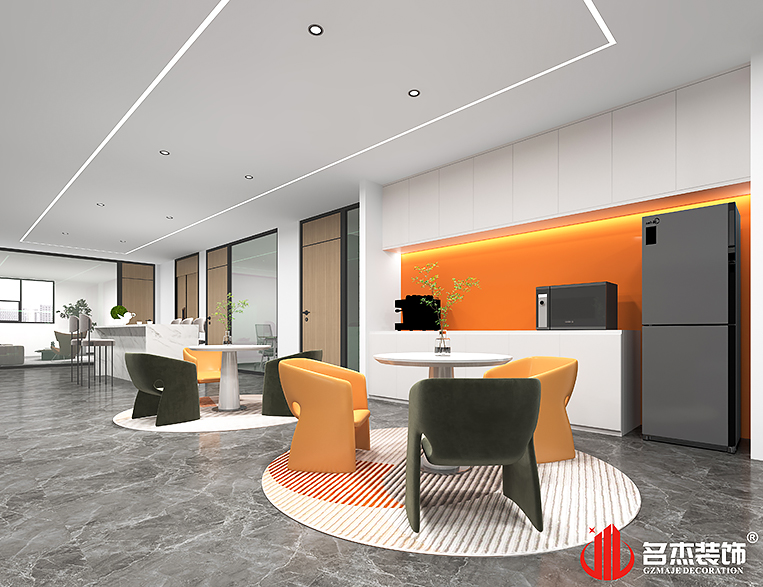 整體辦公空間裝修設計當中使用橙色作為空間的點綴色,讓空間能夠抓人眼球的元素,同時還可以提高辦公室裝修設計空間的層次感。休閑區也使用了較為傳統的元素進行裝修設計,加入亮眼的橙色作為點綴色,可以讓員工得到放松。