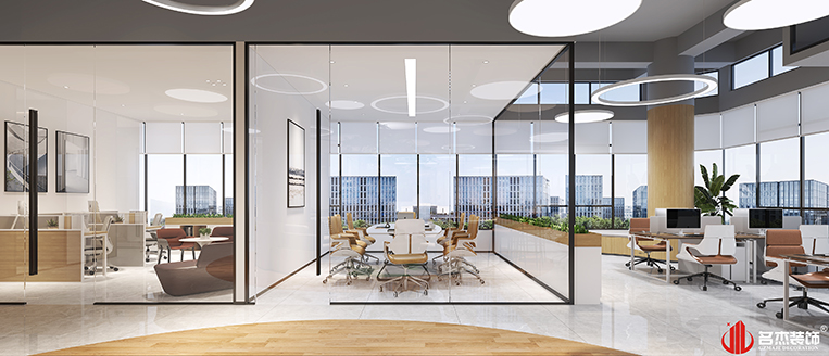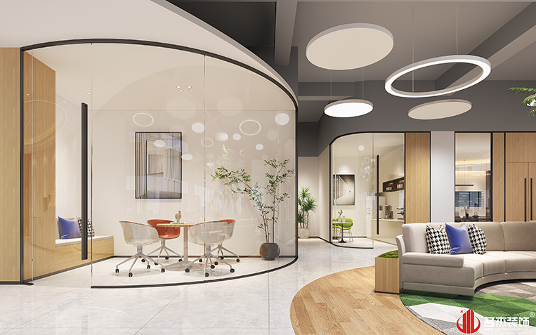 整體風(fēng)格是按照時尚簡約風(fēng)格來設(shè)計的,但是在這里面加入了原木的一些元素,讓整個空間有著清新自然的氛圍,同時圓弧動線的加入也讓空間的整體觀感得到一個很大的提升。特別是在休閑區(qū)這一個區(qū)域,能夠很好的將休閑的元素發(fā)揮出來,在這個空間中顯得尤為突出。在天花區(qū)域,設(shè)計團隊采用的是工業(yè)風(fēng)來打造,但在這個空間加入圓形吊燈和圓形的裝飾物,讓天花區(qū)域看起來更加有特色。#廣州辦公室裝修設(shè)計#