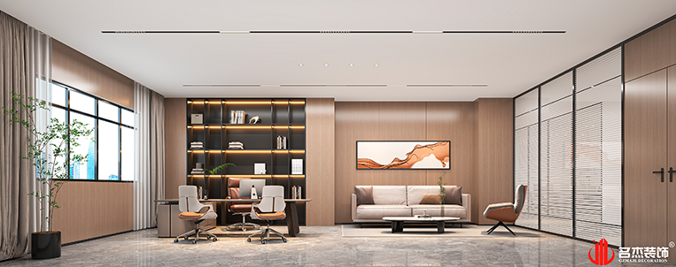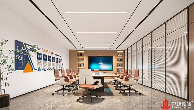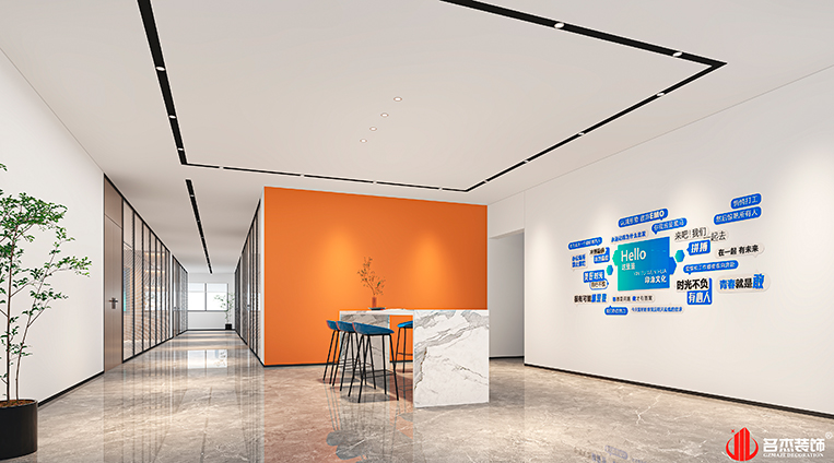 時尚簡約風格為這次的主打風格,同時加入活力橙作為空間的點綴色,讓其空間與市面流行的辦公裝修設計空間有著明顯的區別。活力橙的加入也能為空間注入更多的活力元素,使其空間變得更加有趣。#廣州辦公室裝修設計#