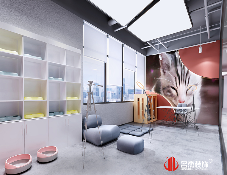 此案例是一家寵物用品店,設(shè)計師按照客戶的要求再結(jié)合該行業(yè)的特點,使用了略帶工業(yè)風格的來做為主基調(diào),利用暖色調(diào)的家具和燈光來調(diào)節(jié)工業(yè)風中的冷。直播間背景墻直接使用了貓咪圖做背景圖,使用兩個圓弧來進行裝飾。