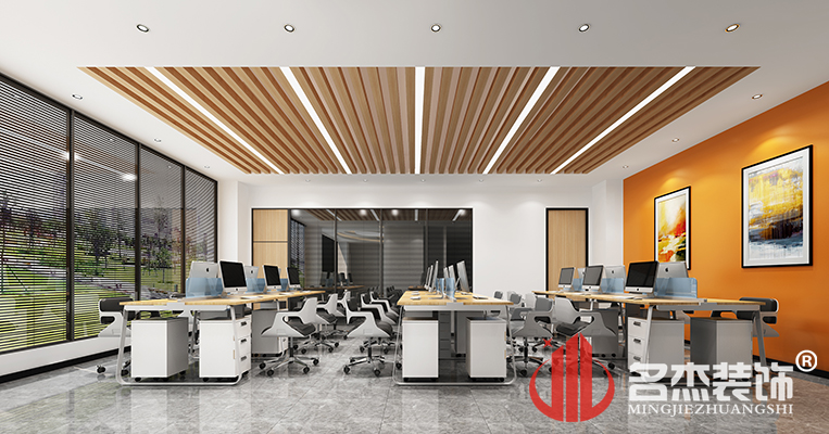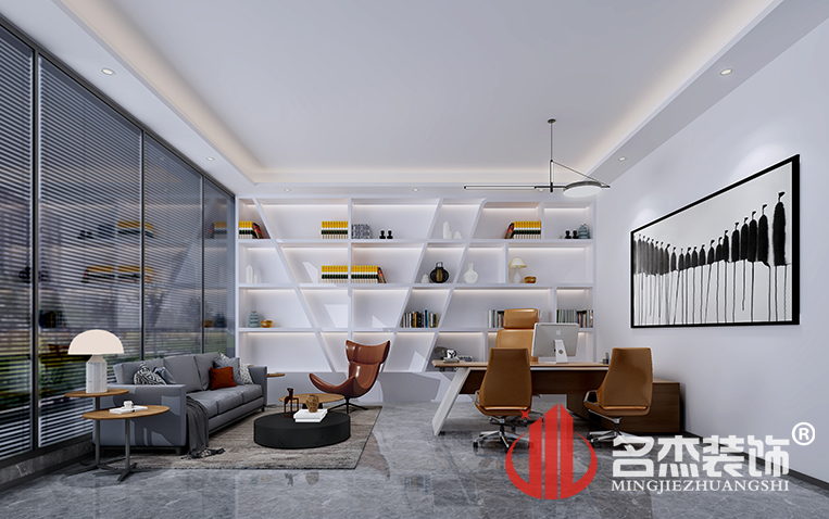 本案例是以商務短版印刷為主的印刷企業,設計師根據客戶的需求以及對整體空間的把控。設計了圓弧型的前臺設計,部分區域使用了活力橙作為突出的顏色,讓整個空間看起來更加充滿活力。