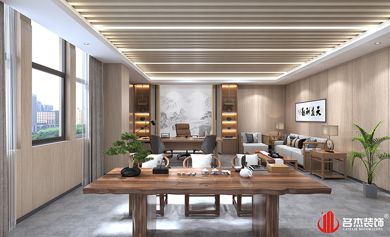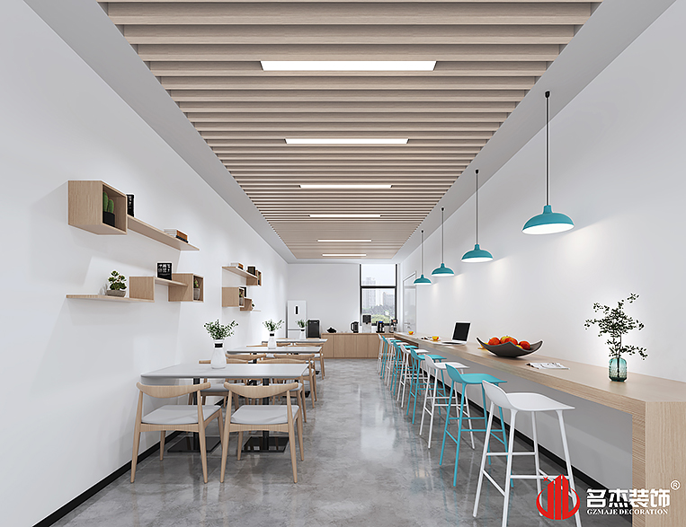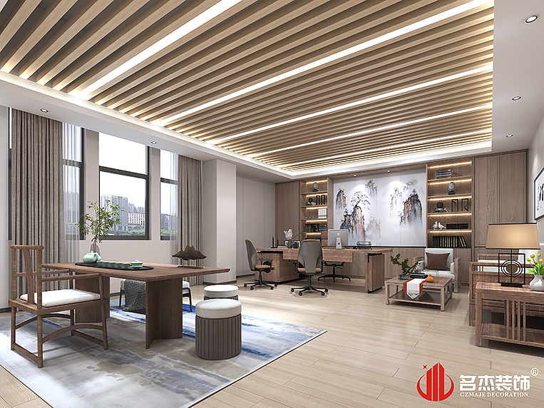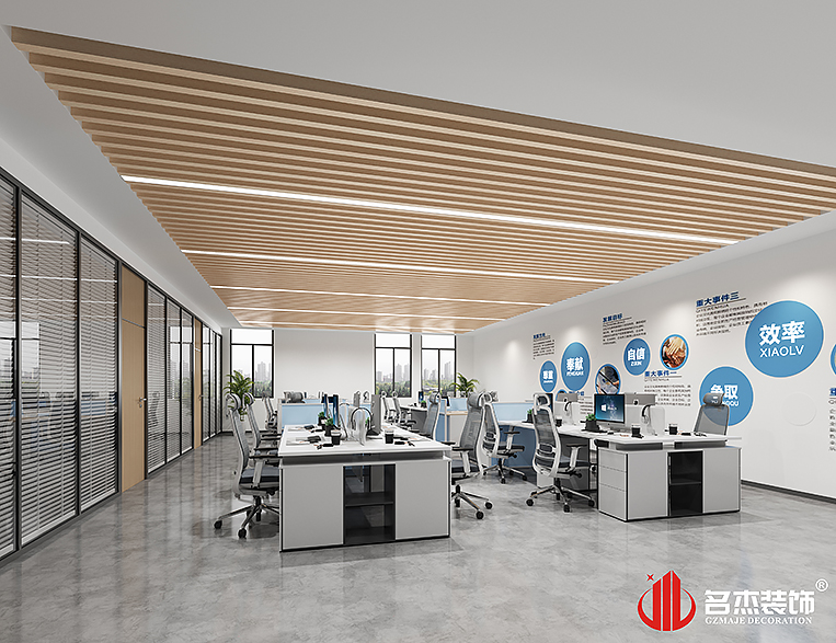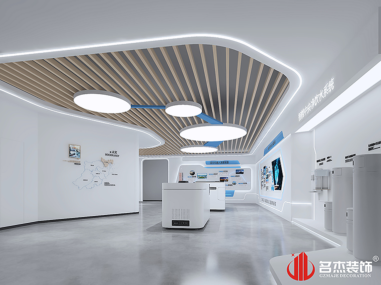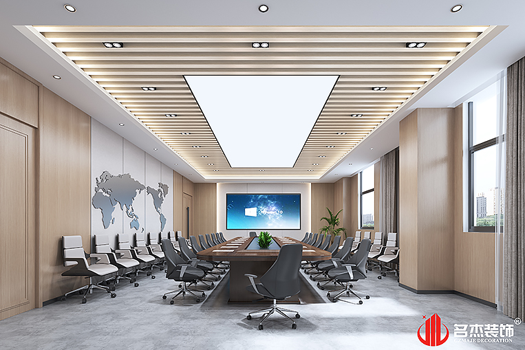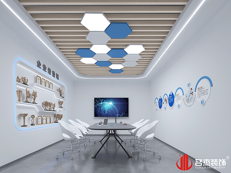 由于該行業(yè)是屬于高新科技行業(yè),設計團隊在整個辦公室裝修設計空間加入木色的吊頂,讓空間的格調(diào)不再屬于冷色調(diào),同時在部分區(qū)域加入科技的元素,響應出該行業(yè)的科技屬性。在展廳區(qū)域則是特意使用上多邊形的木色吊頂,沿著動線來構造,形成一種呼應。